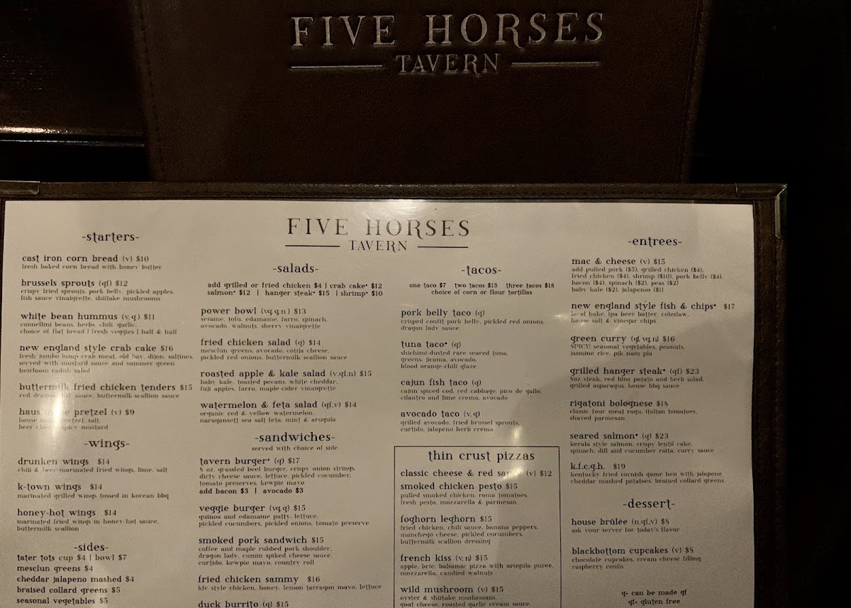 Whether you're craving their delicious Asian wings or indulging in the decadent brunch menu complete with a superb mimosa flight, Five Horses Tavern ensures each meal is not just eaten, but thoroughly enjoyed. Add to that the inviting ambiance and friendly service, and it’s clear why this tavern has become a beloved spot in Boston. Don’t forget to grab an FH hoodie or hat to remember your visit!